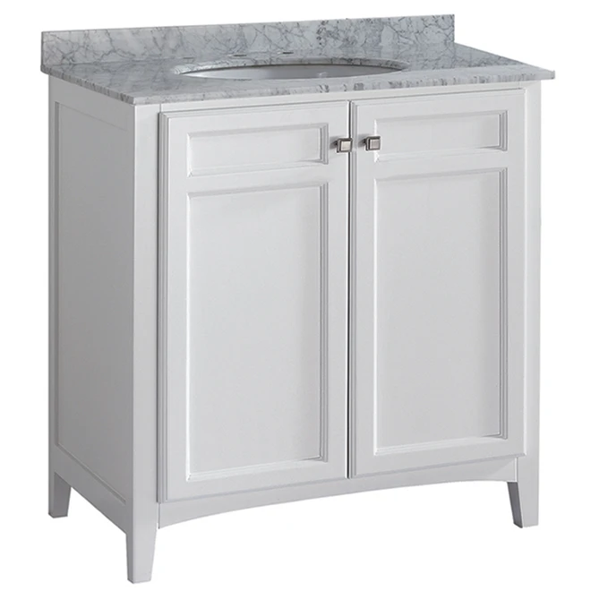 This white bathroom vanity delivers turn-of-the-century modernity to your decor. Designed with a luxurious European Carrara marble top with a pure white finished base, this wooden bathroom vanity makes a bold statement in your space. It features soft-closing doors and a classic structural design. It comes fully assembled for your convenience. This pre-assembled freestanding bathroom vanity includes the vanity, the countertop, and the sink. The top is also pre-drilled for an 8-in widespread faucet. It features a pre-sealed Carrara Marble countertop with round porcelain undermount sink with a matte white finish and chrome knobs.