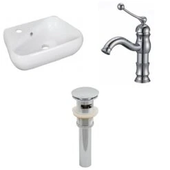 - Includes: 1 bathroom vessel sink in white, 1 bathroom sink faucet in chrome, 1 bathroom sink drain in chrome