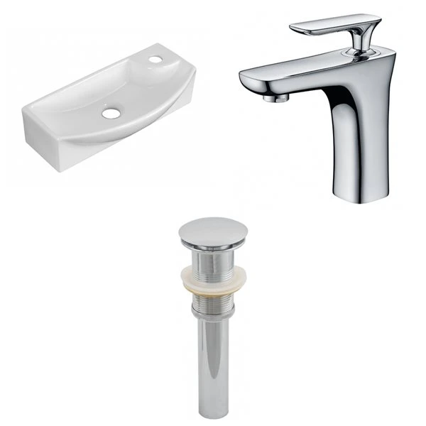 - Includes: 1 bathroom vessel sink in white, 1 bathroom sink faucet in chrome, 1 bathroom sink drain in chrome