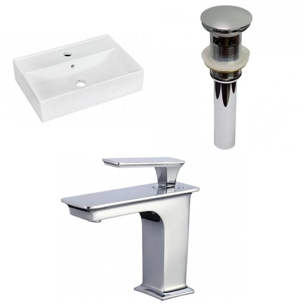 - Includes 1 bathroom vessel sink in white (1331), 1 bathroom sink drain in chrome (1795), 1 bathroom sink faucet in chrome (16750)