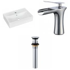 - Includes 1 bathroom vessel sink in white (1331), 1 bathroom sink faucet in chrome (16748), 1 bathroom sink drain in chrome (33592)
