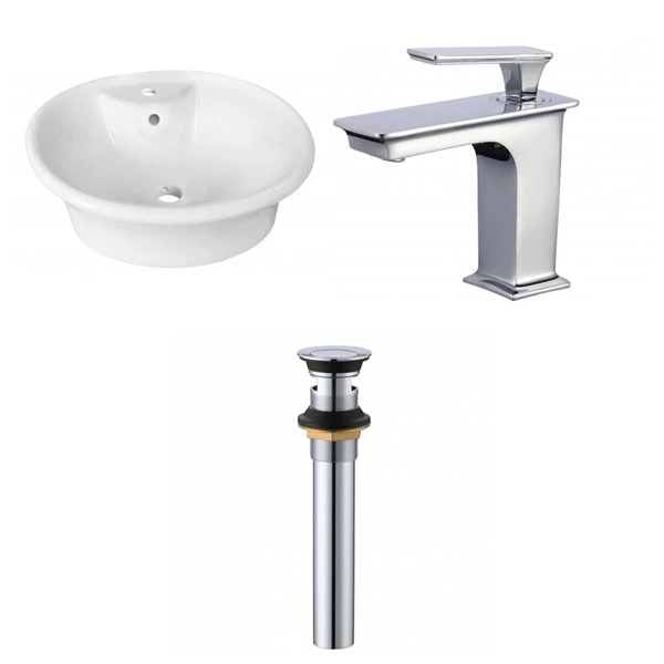 - Includes 1 bathroom vessel sink in white (11017), 1 bathroom sink faucet in chrome (16750), 1 bathroom sink drain in chrome (33592)