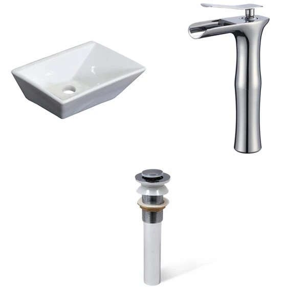 - Includes 1 bathroom vessel sink in white (1243), 1 bathroom sink faucet in chrome (16749), 1 bathroom sink drain in chrome (33593)