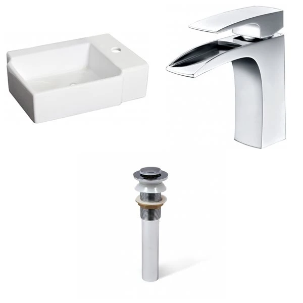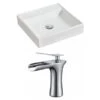 - Includes 1 bathroom vessel sink in white (1303), 1 bathroom sink faucet in chrome (1786), 1 bathroom sink drain in chrome (33593)