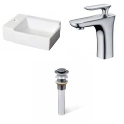- Includes 1 bathroom vessel sink in white (1305), 1 bathroom sink faucet in chrome (1784), 1 bathroom sink drain in chrome (33593)