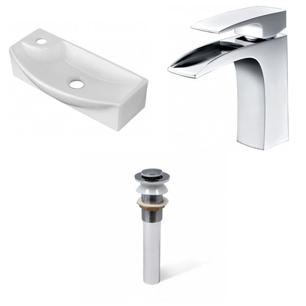 - Includes 1 bathroom vessel sink in white (1756), 1 bathroom sink faucet in chrome (1786), 1 bathroom sink drain in chrome (33593)