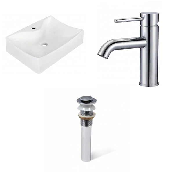 - Includes 1 bathroom vessel sink in white (1732), 1 bathroom sink faucet in chrome (28787), 1 bathroom sink drain in chrome (33593)