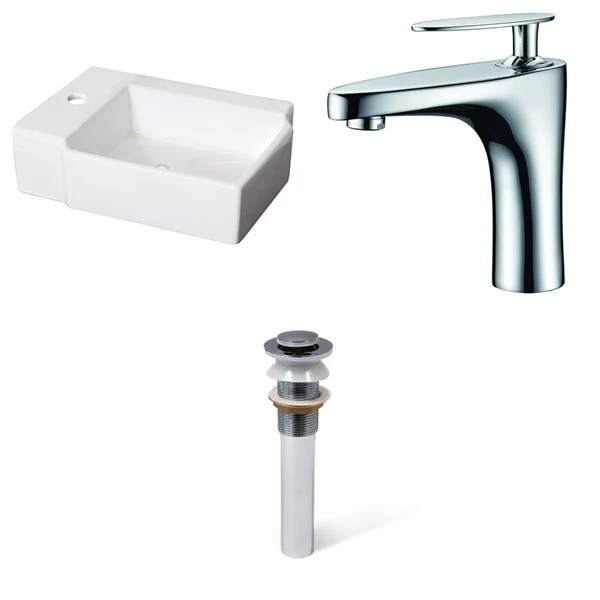 - Includes 1 bathroom vessel sink in white (1307), 1 bathroom sink faucet in chrome (1782), 1 bathroom sink drain in chrome (33593)