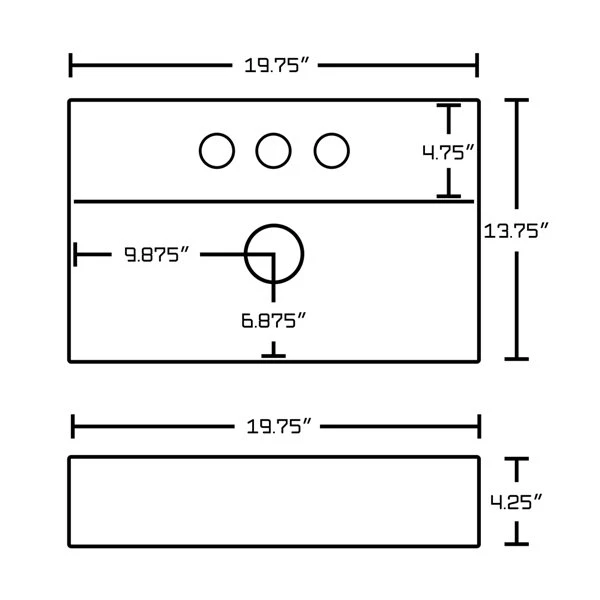 - 19.75-in. Width (left to right). 13.75-in. Depth (back to front). 4.25-in. Height (top to bottom).