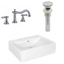 - Includes: 1 bathroom sink faucet in chrome, 1 bathroom sink drain in chrome, 1 bathroom vessel sink in white
