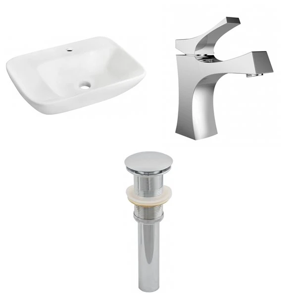 - Includes: 1 bathroom vessel sink in white, 1 bathroom sink faucet in chrome, 1 bathroom sink drain in chrome