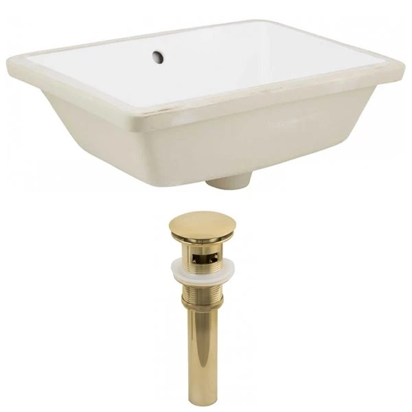 - Includes a bathroom undermount sink in white (324), and a bathroom sink drain in gold (20328)