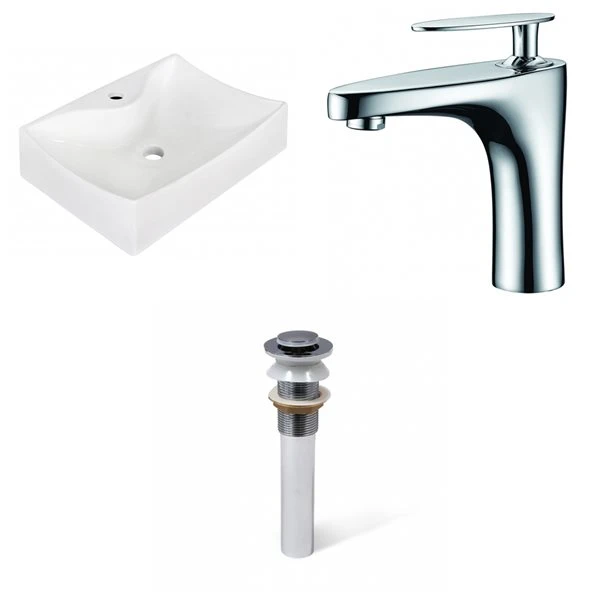 - Includes 1 bathroom vessel sink in white (1732), 1 bathroom sink faucet in chrome (1782), 1 bathroom sink drain in chrome (33593)