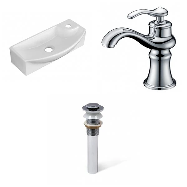 - Includes 1 bathroom vessel sink in white (1757), 1 bathroom sink faucet in chrome (1779), 1 bathroom sink drain in chrome (33593)