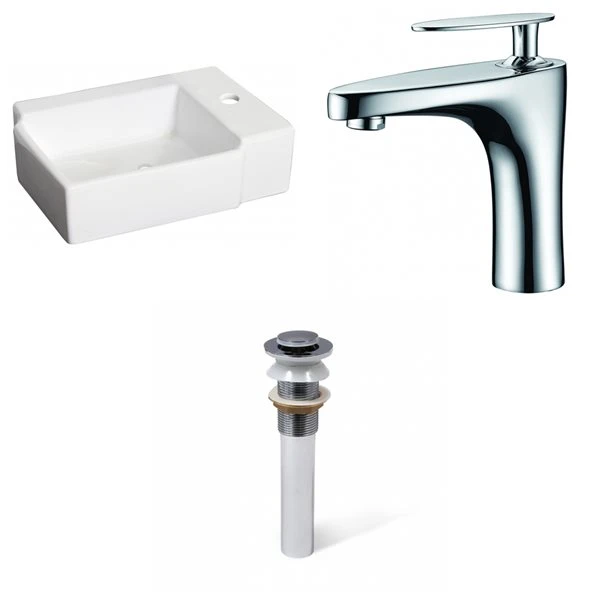- Includes 1 bathroom vessel sink in white (1301), 1 bathroom sink faucet in chrome (1782), 1 bathroom sink drain in chrome (33593)