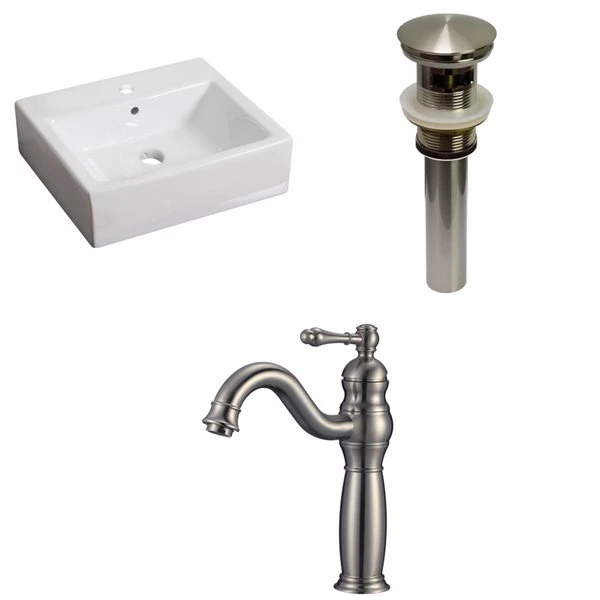 - Includes 1 white bathroom sink, 1 brushed nickel drain and 1 brushed nickel faucet