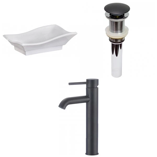 - Includes a bathroom vessel sink in white, a bathroom sink drain in black, a bathroom sink faucet in black