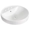 - Includes a bathroom vessel sink in white, a bathroom sink drain in black, a bathroom sink faucet in black