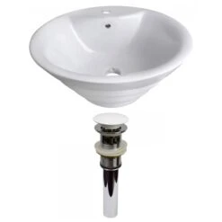 - Includes a bathroom vessel sink in white, and a bathroom sink drain in white