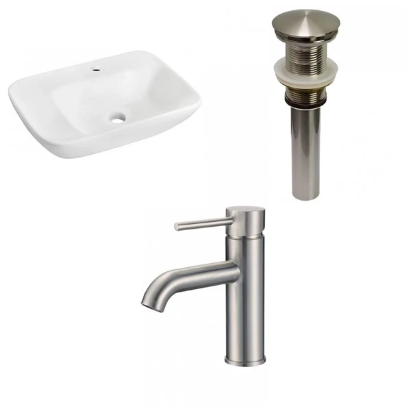 - Includes a bathroom vessel sink in white, a bathroom sink drain in brushed nickel, a bathroom sink faucet in brushed nickel