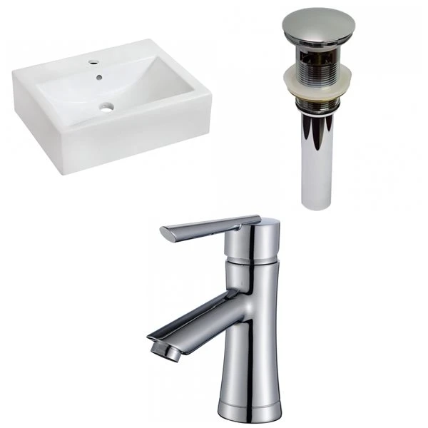 - Includes a bathroom vessel sink in white, a bathroom sink drain in chrome, a bathroom sink faucet in chrome