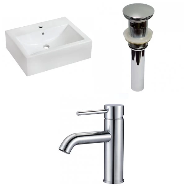 - Includes a bathroom vessel sink in white, a bathroom sink drain in chrome, a bathroom sink faucet in chrome