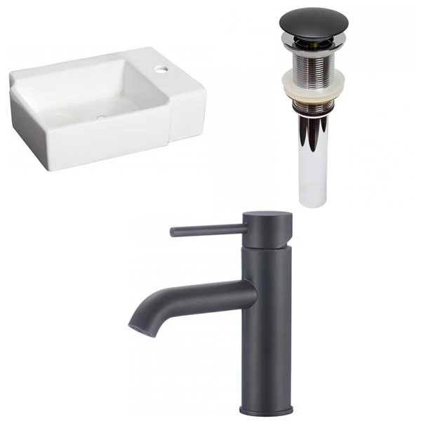 - Includes a bathroom vessel sink in white, a bathroom sink drain in black, a bathroom sink faucet in black