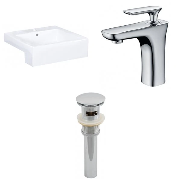 - Includes: 1 bathroom vessel sink in white, 1 bathroom sink faucet in chrome, 1 bathroom sink drain in chrome