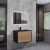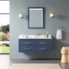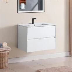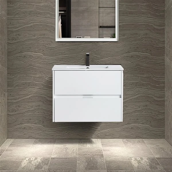 - The wall-mounted vanity has a wood-grain look that offers you a contemporary mood with the hardware-free flat-paneled door and drawer