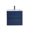Modern angles characterize the bathroom vanity. This wall-mounted piece boasts two handleless drawers to store your essentials in style. A beautiful thick quartz countertop with two undermount sink basins creates a sense of contrast and brings simple elegance to your bathroom space.