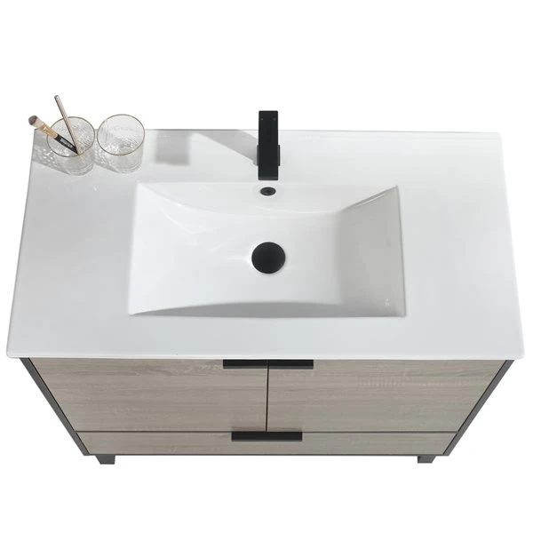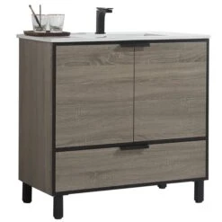 Floor vanity has a wood-grain appearance, simple lines outline a modern design sense of bathroom cabinet, meet the modern decoration design aesthetics, but also meet the demand for bathroom storage. Made of 100% solid wood multi-layer design, its structure makes the product more durable. The one-piece ceramic basin design allows you to save width while having a larger internal diameter.