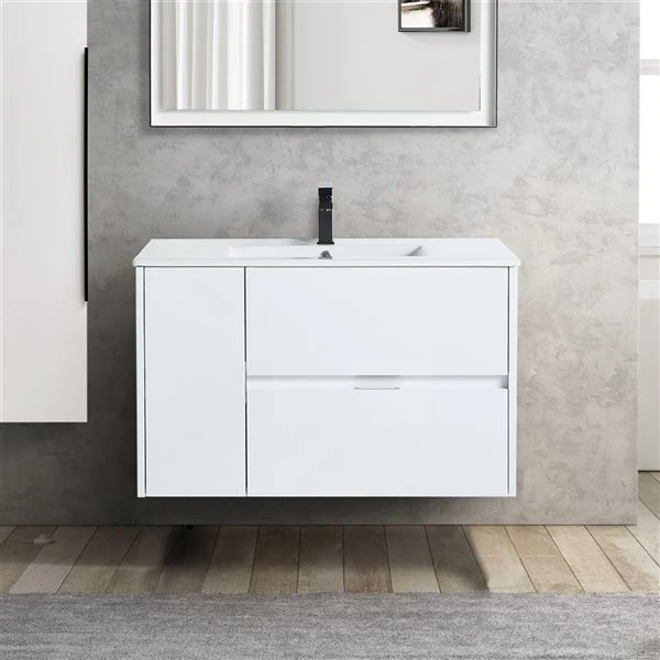 - The wall-mounted vanity has a wood-grain look that offers you a contemporary mood with the hardware-free flat-paneled door and drawer