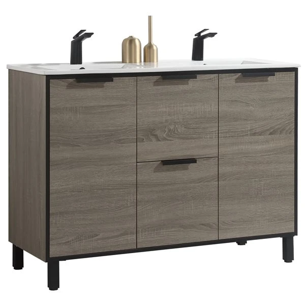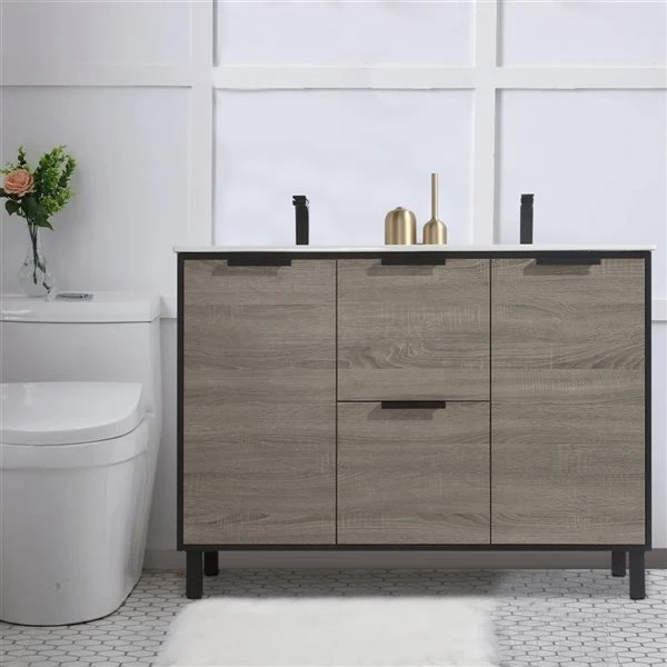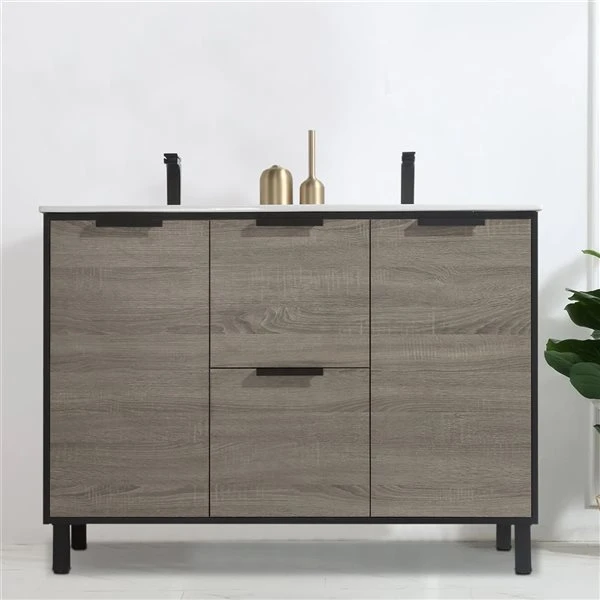 Floor vanity has a wood-grain appearance, simple lines outline a modern design sense of bathroom cabinet, meet the modern decoration design aesthetics, but also meet the demand for bathroom storage. Made of 100% solid wood multi-layer design, its structure makes the product more durable. The one-piece ceramic basin design allows you to save width while having a larger internal diameter.