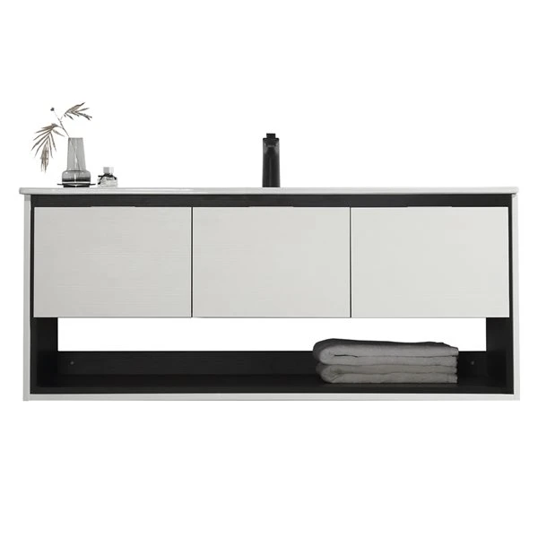 The wall-mounted vanity has a wood-grain look that offers you a contemporary mood with the hardware-free flat-panelled door and drawer. The single u-drawer and 2 cabinet doors pull out for storage while the open space below allows you to place extra towels or various other essentials. The simple lines outline the design with a modern sense, hidden handles ensure the integrity of the wood grain which meets the design beauty of modern decoration and the demand for bathroom storage. A simple and relaxed attitude to life requires only such a set of modern and simple bathroom cabinets.