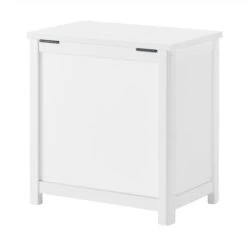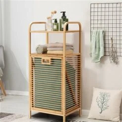This tilt-out bamboo laundry hamper with shelves has a bamboo slatted frame with 2 storage shelves above the tilt-out hamper space.