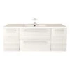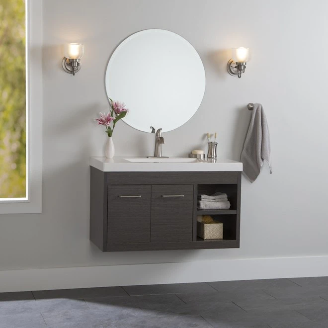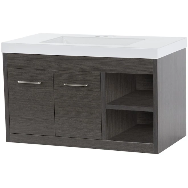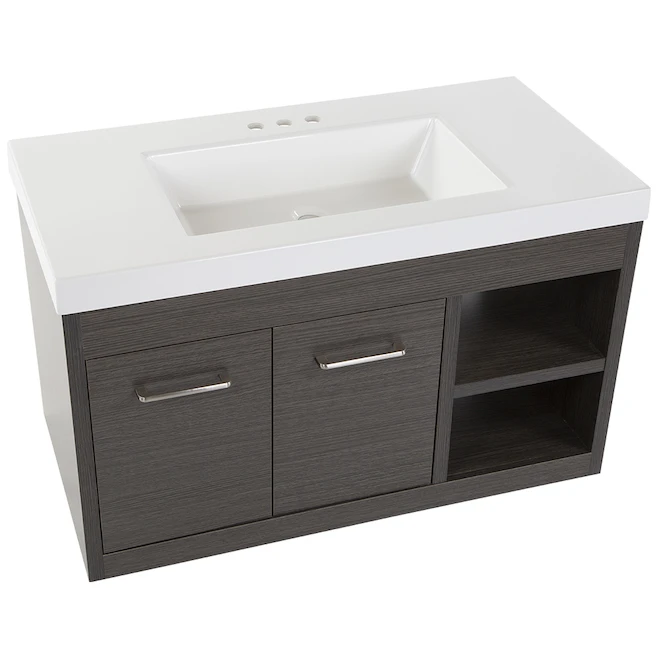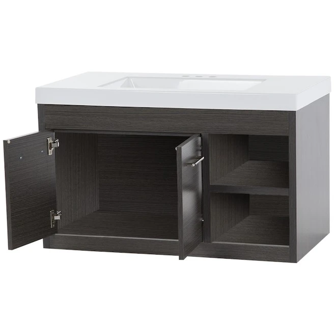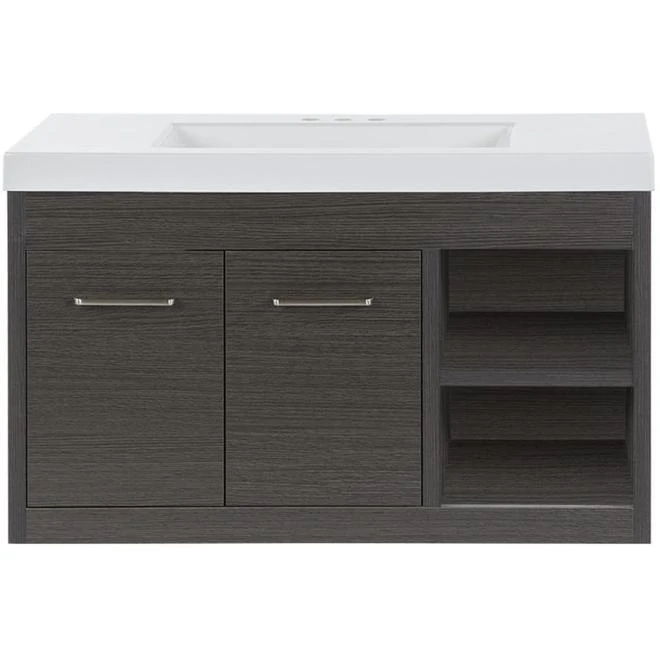 Modern textured wall hung vanity combo designed to focus on contemporary appearance. A textured finish and open shelving make this vanity an absolute must have. Pre-drilled for easy installation of a 4-in minispread faucet (faucet sold separately). Double door and open shelving provides for plenty of storage. Unique contemporary design to highlight any bathroom