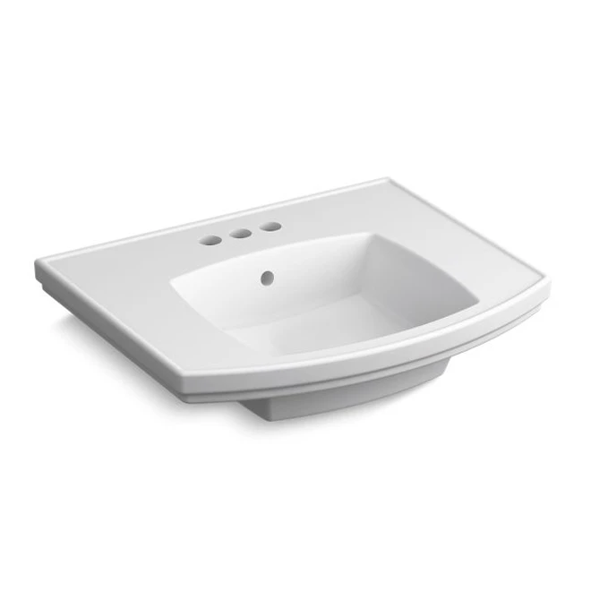 Clean, contemporary and stylish, this Kohler pedestal sink basin is a perfect choice for any bathroom setting. The rectangular design has plenty of deck space on the sides so that you can keep necessities close at hand. With three 4-inch (10.16 cm) centerset holes, you can install a variety of different faucet styles to suit your space. The porcelain sink also includes a pre-drilled overflow drain. Great for smaller spaces, the basin pairs with Kohler Elliston pedestal base model K-R6375.