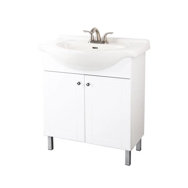 This Facto Euro vanity on legs is both easy to install and easy to maintain. This pre-assembled product includes decorative hardware and a chic white sink made of vitreous china. The cabinet is white on the outside and on the inside for a clean overall look. It comes with soft-close doors, a very practical feature! This freestanding vanity is CARB compliant and complies with federal lead guidelines. Choose this 30-in x 34-in x 19-in format for small to medium bathrooms. It is covered by a 1-year warranty on parts and labour. Faucet, mirror and drain are not included.