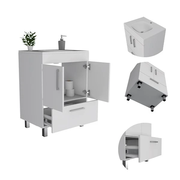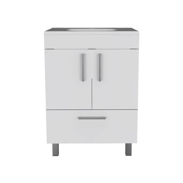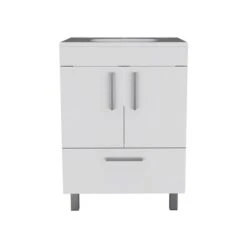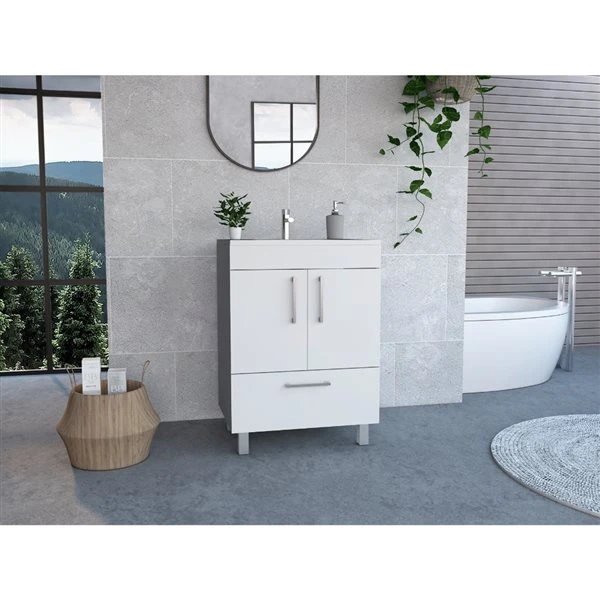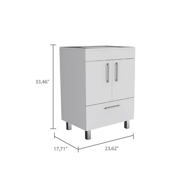 The vanity adds a bit of order to your bathroom while also adding a unique aesthetic. Its contemporary and ergonomic design fits any bathroom, even the smallest, with its dimensions (33.46-in H x 23.62-in W x 17.71-in D). It offers a vast storage capacity and a two-door cabinet with one drawer (22.4-in W x 15.5-in H) to keep your items safe and the perfect countertop (29.5-in). Specifically designed to tolerate the bathroom’s dampness. The faucet is not included.