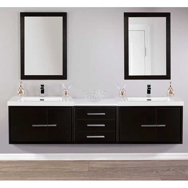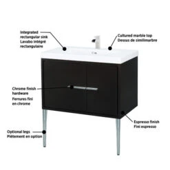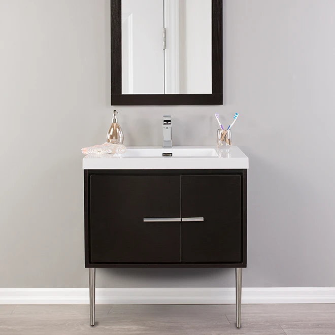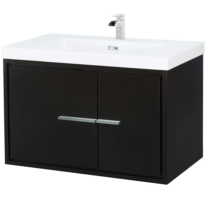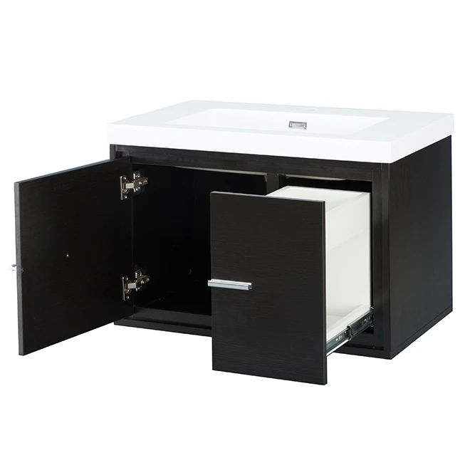 Enhance your DIY bathroom remodelling experience using this Foremost Carlington vanity. The 30-in W model comes fully assembled to enable fast installation, which saves you time. Equipped with multiple mounting options, this vanity supports installation on a wall or the floor for increased versatility. Compactly built, its minimalistic layout saves space. The wall-hung vanity leaves ample space beneath it to allow for use with wheelchairs or toddler steps. Its independent mounting layout and polished surfaces make it easy to clean and maintain. Designed with dual built-in shelves and a pull-out drawer, it offers a large storage area for increased functionality. This single door vanity has a contemporary espresso finish and chrome-plated hardware for enhanced aesthetics. Built with a cultured-marble countertop and sink, it’s durable. This vanity sink has an overflow feature which eliminates messy spills during use. It comes with a 1-year warranty.