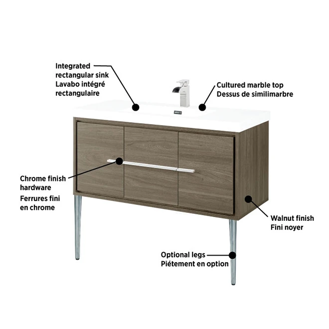 Recreate your bathroom space with this modern FOREMOST Carlington vanity. It offers a contemporary style with two slow-closing doors and two u-shaped drawers for storage space. The walnut finish blends with many interior design styles and generates a warm and comfortable feel. The vanity includes an integrated rectangular sink with a drilled, single tap hole and a rear overflow. It also comes with two optional metal legs, which provides you with the option of mounting it on the wall or letting it stand. The walnut, floating-vanity’s cultured-marble countertop is resistant to UV rays, so it will maintain its colour over a long period of time. The faux marble is durable and easy to clean, which is a boon for busy families. This two-door vanity includes chrome-plated handles that are corrosion resistant for a decorative and easy to clean surface. It measures 42 in L x 20-1/4 in H x 18 in D and comes with a 1-year warranty.