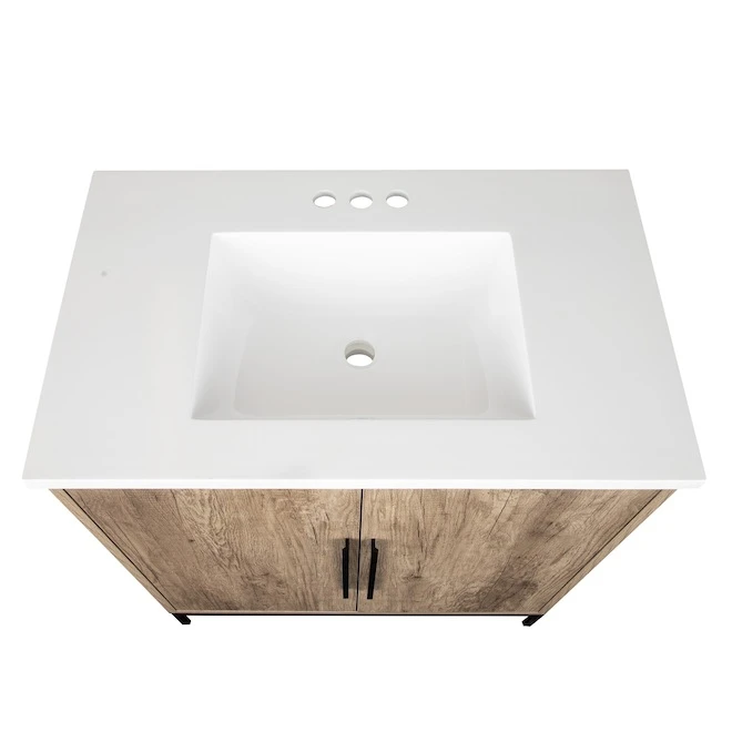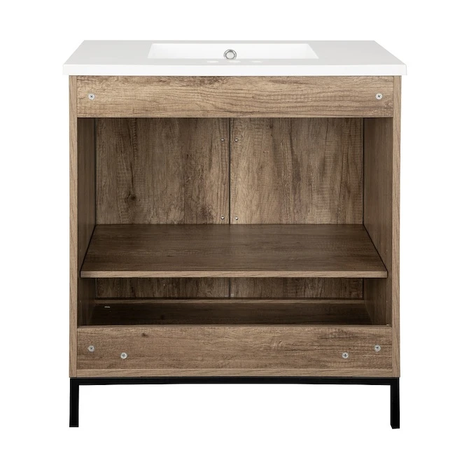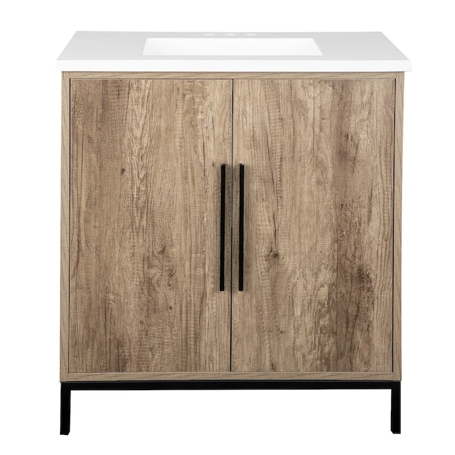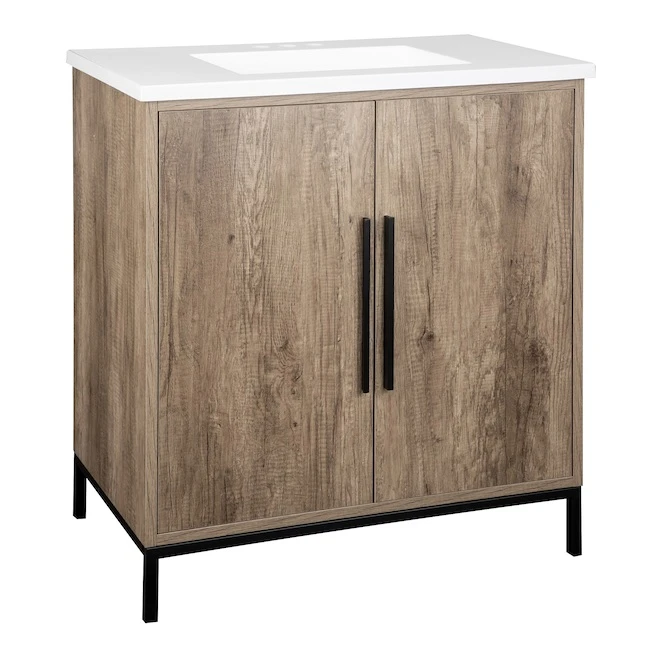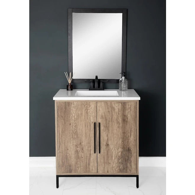 This 31-inch vanity in the Amber Ridge colour features two regular doors with a shelf inside. Matte black metal handles and base give it a modern, minimalist look. Its cultured marble top with integrated sink and 4-inch centre faucet complete its look. Finally, this vanity comes with a 24-inch black textured melamine mirror with flat edges. Covered by a 1-year limited warranty.