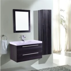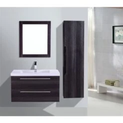 This modern wall mounted Bathroom Vanity features an elegant wood embossed deep textured melamine finish. Its simple, minimalistic look is sure to modernize and liven up any bathroom design, whether dark, light or in between, and contrasts beautifully with any ceramic tiling style. Its countertop is made from a durable acrylic material less likely to break then traditional ceramic or porcelain. It is also easier to clean and requires minimal maintenance.