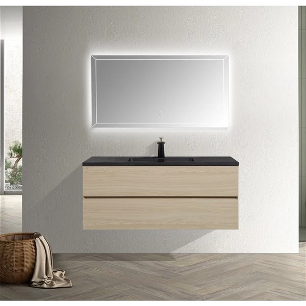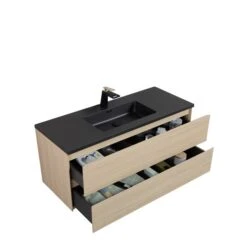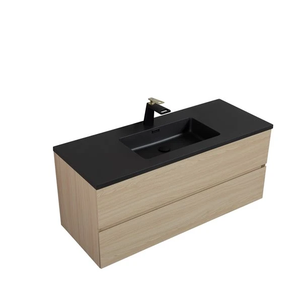 The precision craftsmanship and simple modern design come together with this elegant floating vanity. Its black modified Quartz top and a high-end wood imitation finish make this the perfect blend in any new bathroom project.