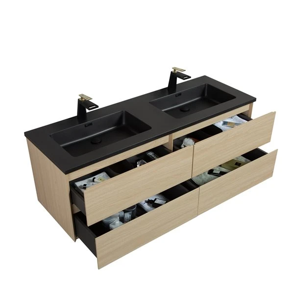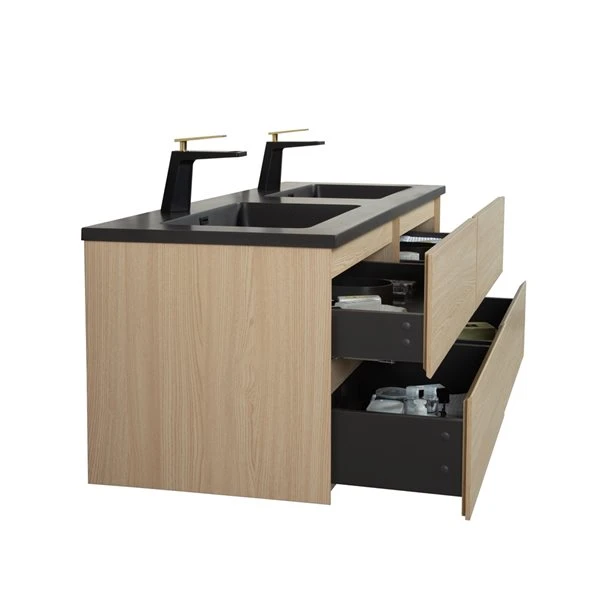 The precision craftsmanship and simple modern design come together with this elegant floating vanity. Its Black Modified Quartz top and a high-end wood imitation finish make this the perfect blend in any new bathroom project.