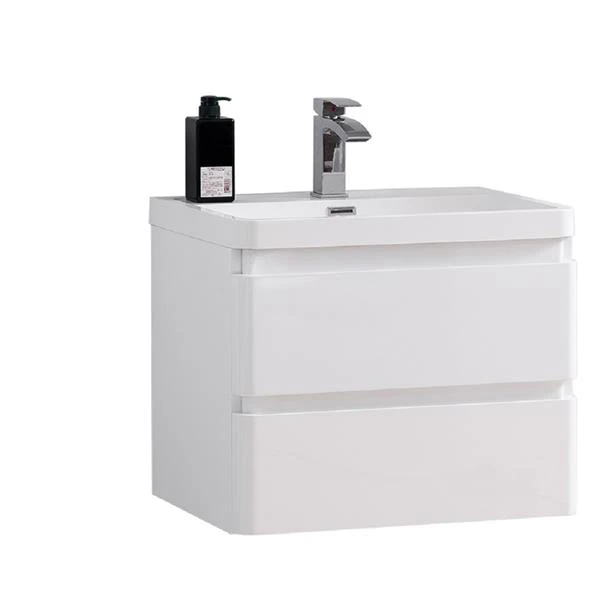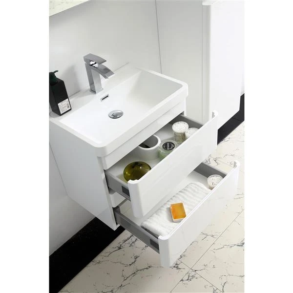 This modern single sink wall mounted bathroom vanity features an elegant white finish. It’s simple, minimalist look is sure to modernize and liven up any bathroom design whether dark, light or in between. This vanity contrasts beautifully with any ceramic tiling style.