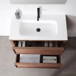 The all-new freestanding vanity, Vanessa takes a bold step ahead when it comes to design. Demonstrating craftsmanship excellence, this vanity features two to four flush soft closing “smart” drawers, made specifically to accommodate plumbing while still giving you the most amount of storage space out of your vanity. The Vanessa vanity features an elegant wood embossed all-natural America walnut veneer finish. Its simple, minimalist look is sure to modernize and liven up any bathroom design and contrasts beautifully with any ceramic tiling style.