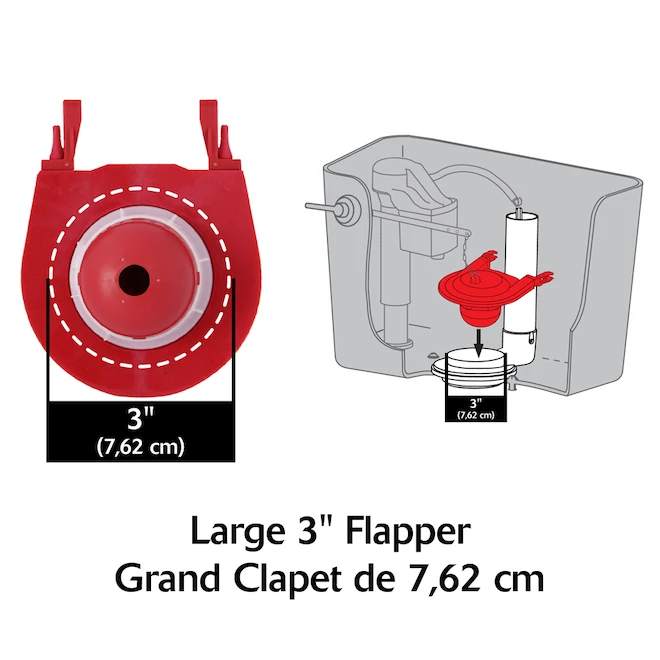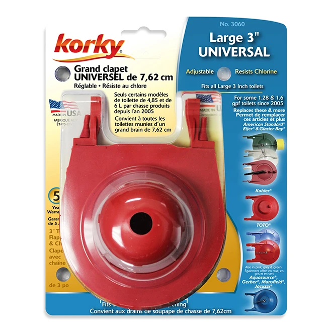 Ensure peak performance of your toilet using this 3-in dia, Korky large tank flapper for a High-efficiency toilet (HET). Manufactured from a rust-resistant rubber material, it’s durable. The flexible, toilet-tank flapper conforms to uneven surfaces to ensure watertight installation. Its tough construction resists corrosion by most chemicals such as chlorine to allow use in treated water systems. Crafted in an adjustable layout, the universal, large toilet flapper fits a broad range of HET toilet brands such as American Standard and Aquasource. Its lightweight construction makes it easy to handle and install, which helps reduce toilet maintenance time. This Korky tank flapper comes with a lift chain that raises and lowers it to create the flush cycle. Made from stainless steel materials, the built-in chain resists rust for increased longevity.