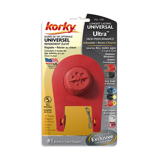Eliminate water waste by adjusting the amount of water flushed with this Korky ultra flapper. Built with a universal design, the Korky flapper adapts to fit 2-in toilet tanks. Designed with long-lasting rubber, the red toilet flapper is resistant to chlorine, bacteria and hard water. Save on installation costs by installing the Korky rubber flapper without any special equipment. The flapper works with tanks emitting 1.6-, 1.28-, 5- and 3.5-gal. per flush. The 2-in toilet flapper’s flexible rubber also allows it to provide a watertight seal. The adjustable rubber-flapper kit comes with a flapper and a stainless steel chain. It measures 2 in dia. This Korky adjustable flapper comes with a 5-year warranty.