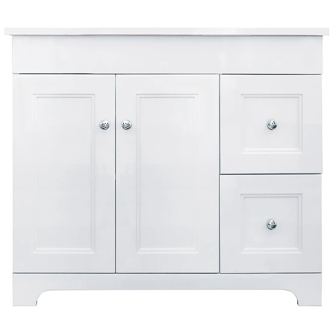 Give your bathroom plenty of storage and an updated appearance with this Luxo Marbre vanity. Two drawers on the right-hand side provide pullout storage. Two doors open beneath the sink to provide additional space for a clutter-free bathroom. Shaker-style panels on the doors and drawers offer a classic look. A white, synthetic-marble sink with a pre-drilled faucet hole sits on top of the two-door bathroom vanity. The faucet is sold separately, so you can choose one that suits your tastes. Built-in overflow protection in the sink helps prevent flooding. Lacquered medium-density fiberboard (MDF) makes the freestanding vanity durable and long lasting. The 2-drawer vanity unit measures 37 in W x 34 in H x 22 in D to save space. Add a classic look to your bathroom with this white unit that has round, polished-silver door and drawer handles. It comes fully assembled to make installation easy. A 1-year warranty protects your investment.